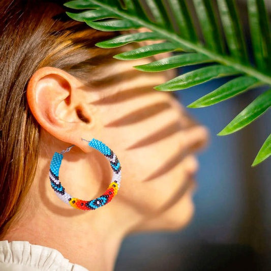 Native Inspired Black Round Beaded Handmade Hoop Earrings for Women