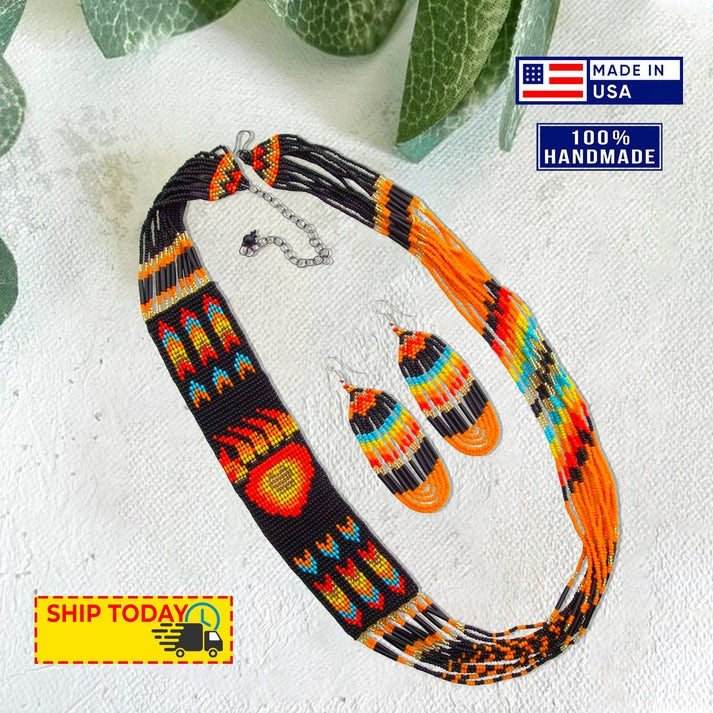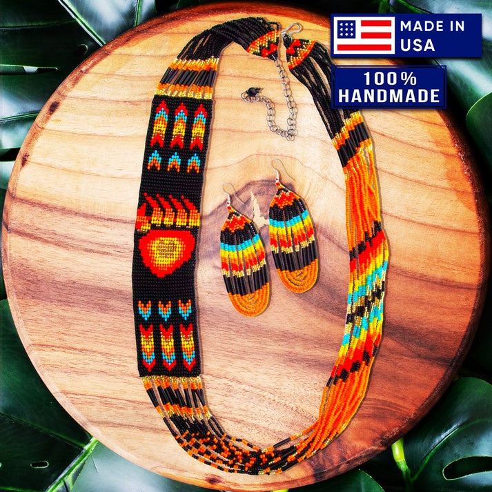 This stunning beaded jewelry set features a matching necklace and earrings, each beautifully inspired by traditional Native American motifs. The intricate beadwork captures the artistry and cultural heritage of Indigenous craftsmanship, making every piece truly special.