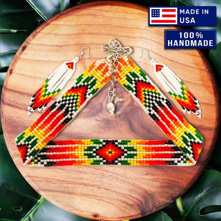 This beautifully handcrafted jewelry set features traditional Native American-inspired beadwork, including a matching necklace and earrings. Each piece showcases intricate geometric designs and vibrant colors made with carefully selected glass beads.