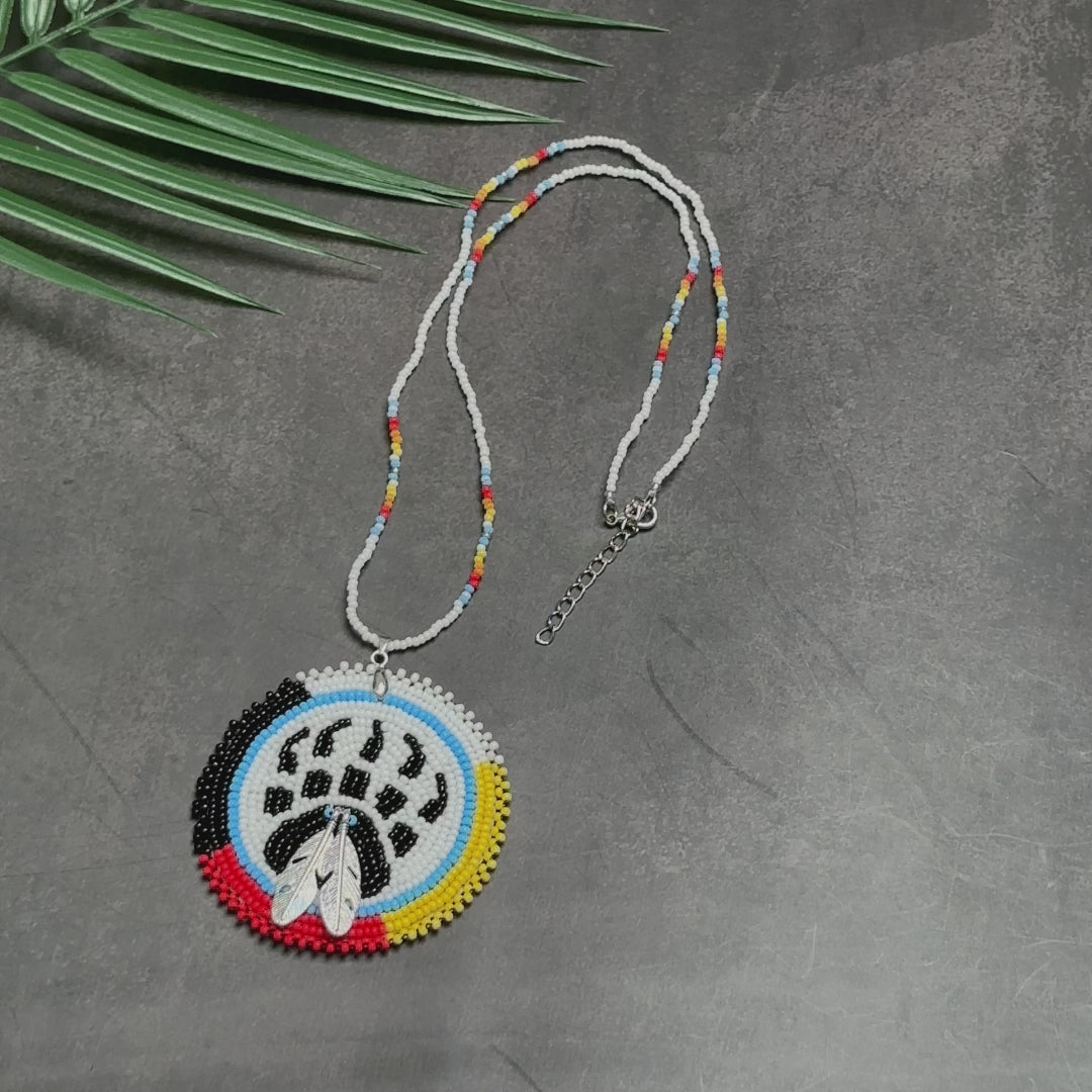 This beaded necklace features a striking centerpiece patch, handcrafted with intricate patterns inspired by Native American artistry. Each bead is carefully stitched to honor tradition, symbolizing unity, heritage, and creativity.