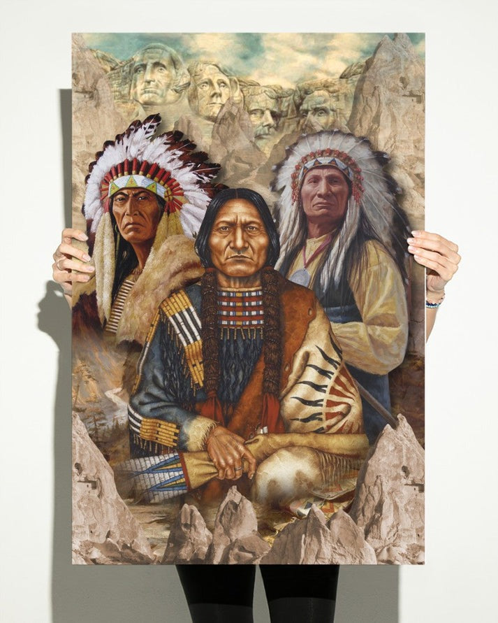 Honor history and resilience with the Native American Chiefs Wall Art. This powerful piece features three proud leaders standing before the backdrop of Mount Rushmore, creating a striking contrast between Native heritage and American history.