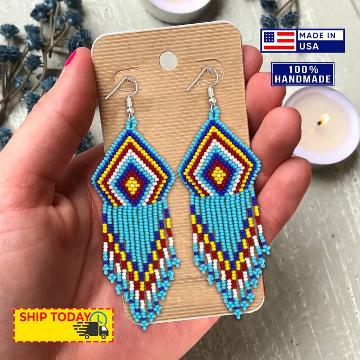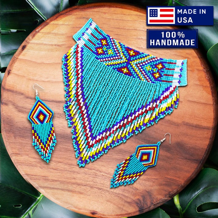 This beautifully handcrafted jewelry set features traditional Native American-inspired beadwork, including a matching necklace and earrings. Each piece showcases intricate geometric designs and vibrant colors made with carefully selected glass beads.